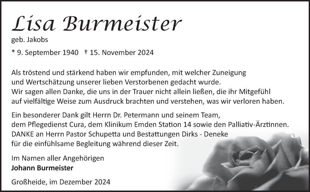 Hier finden Sie alle Traueranzeigen aus der Zeitung, die bisher für Lisa Burmeister erschienen sind. Weitere Traueranzeigen, die in der Zeitung erscheinen, werden hier ebenfalls aufgelistet