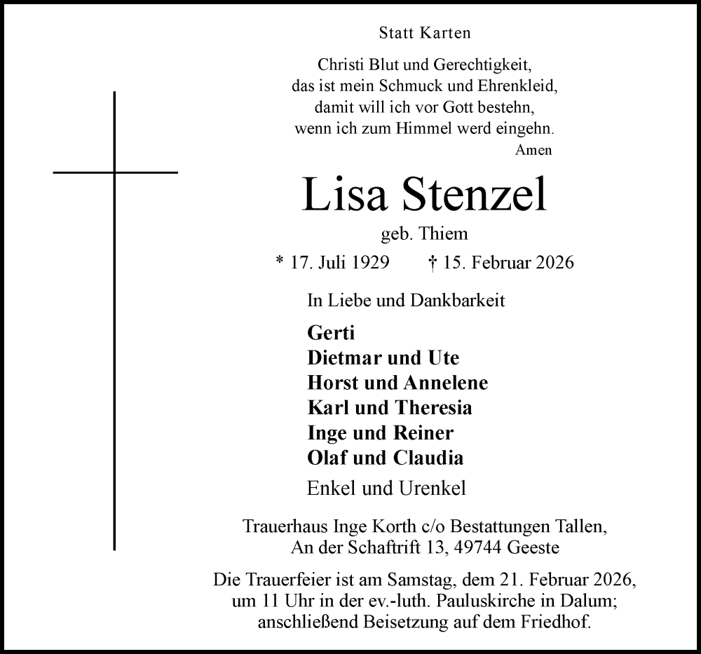 Hier finden Sie alle Traueranzeigen aus der Zeitung, die bisher für Lisa Stenzel erschienen sind. Weitere Traueranzeigen, die in der Zeitung erscheinen, werden hier ebenfalls aufgelistet