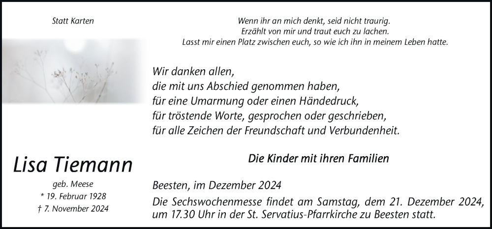 Hier finden Sie alle Traueranzeigen aus der Zeitung, die bisher für Lisa Tiemann erschienen sind. Weitere Traueranzeigen, die in der Zeitung erscheinen, werden hier ebenfalls aufgelistet
