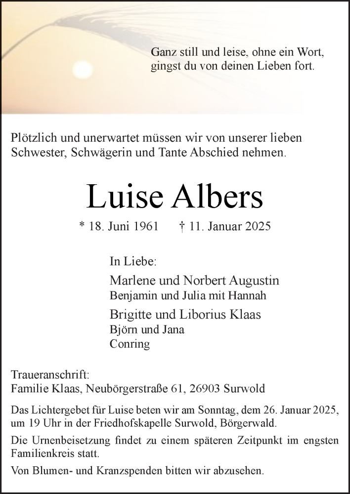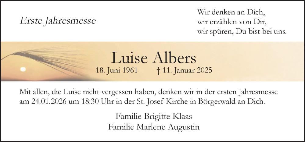 Hier finden Sie alle Traueranzeigen aus der Zeitung, die bisher für Luise Albers erschienen sind. Weitere Traueranzeigen, die in der Zeitung erscheinen, werden hier ebenfalls aufgelistet
