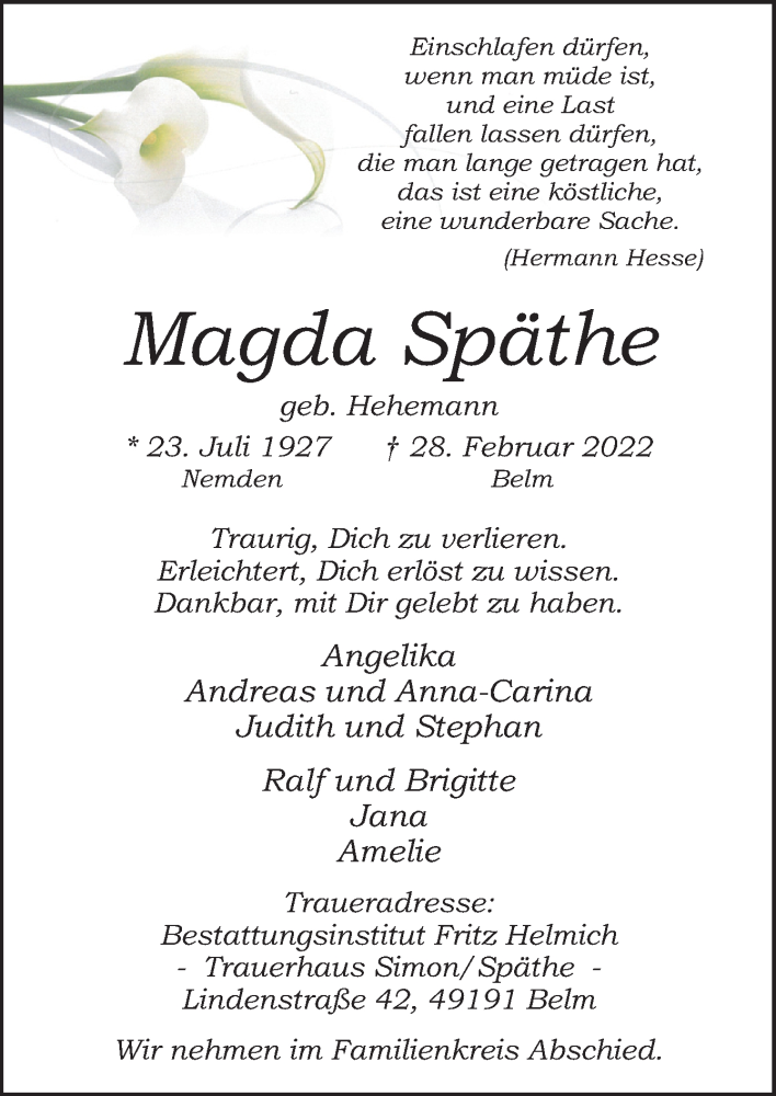 Hier finden Sie alle Traueranzeigen aus der Zeitung, die bisher für Magda Späthe erschienen sind. Weitere Traueranzeigen, die in der Zeitung erscheinen, werden hier ebenfalls aufgelistet