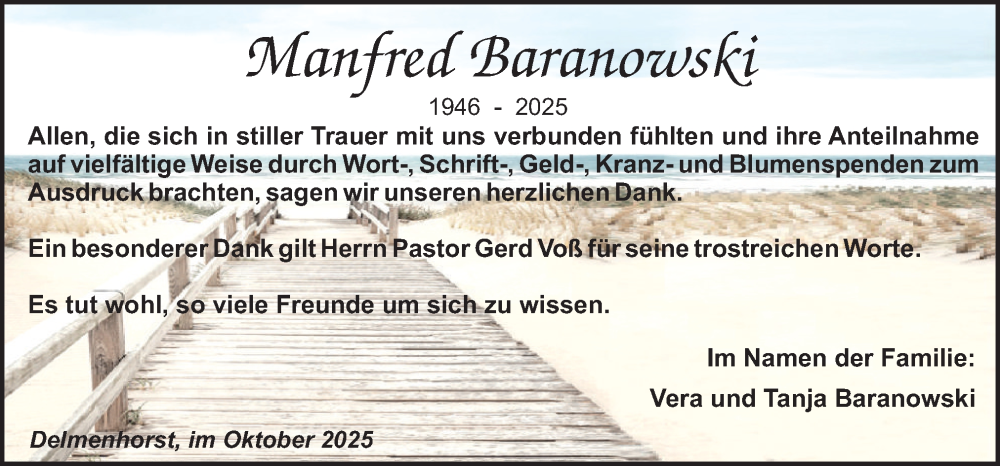 Hier finden Sie alle Traueranzeigen aus der Zeitung, die bisher für Manfred Baranowski erschienen sind. Weitere Traueranzeigen, die in der Zeitung erscheinen, werden hier ebenfalls aufgelistet