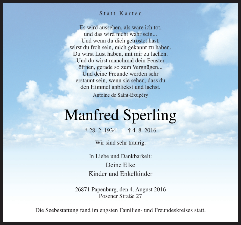 Hier finden Sie alle Traueranzeigen aus der Zeitung, die bisher für Manfred Sperling erschienen sind. Weitere Traueranzeigen, die in der Zeitung erscheinen, werden hier ebenfalls aufgelistet