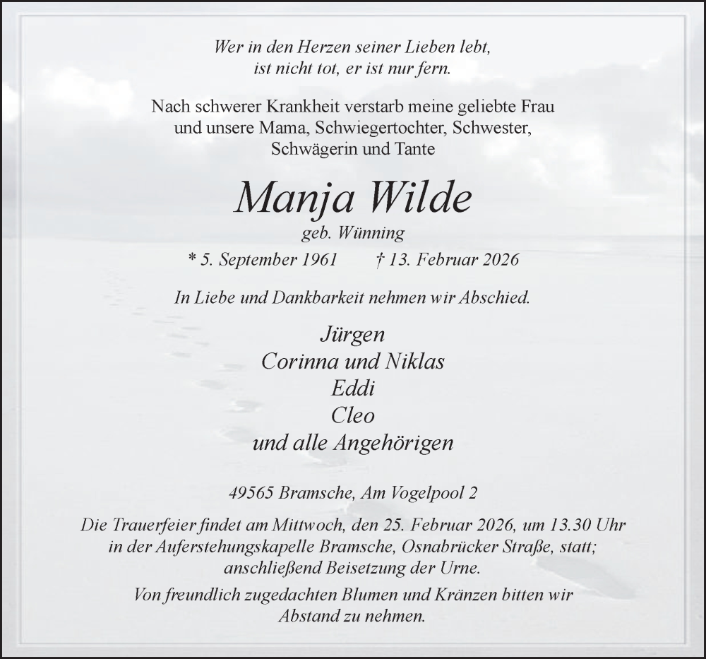 Hier finden Sie alle Traueranzeigen aus der Zeitung, die bisher für Manja Wilde erschienen sind. Weitere Traueranzeigen, die in der Zeitung erscheinen, werden hier ebenfalls aufgelistet