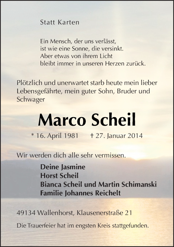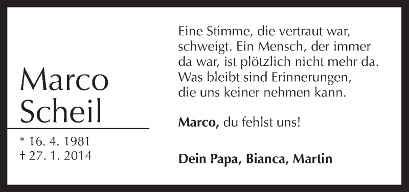 Hier finden Sie alle Traueranzeigen aus der Zeitung, die bisher für Marco Scheil erschienen sind. Weitere Traueranzeigen, die in der Zeitung erscheinen, werden hier ebenfalls aufgelistet
