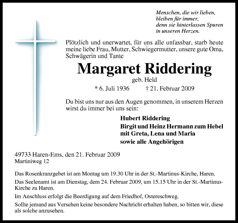 Hier finden Sie alle Traueranzeigen aus der Zeitung, die bisher für Margaret Riddering erschienen sind. Weitere Traueranzeigen, die in der Zeitung erscheinen, werden hier ebenfalls aufgelistet