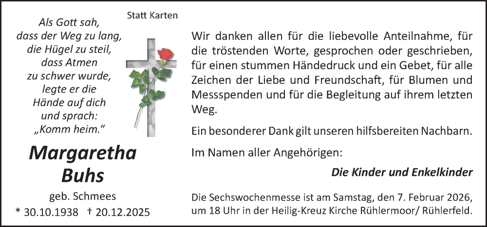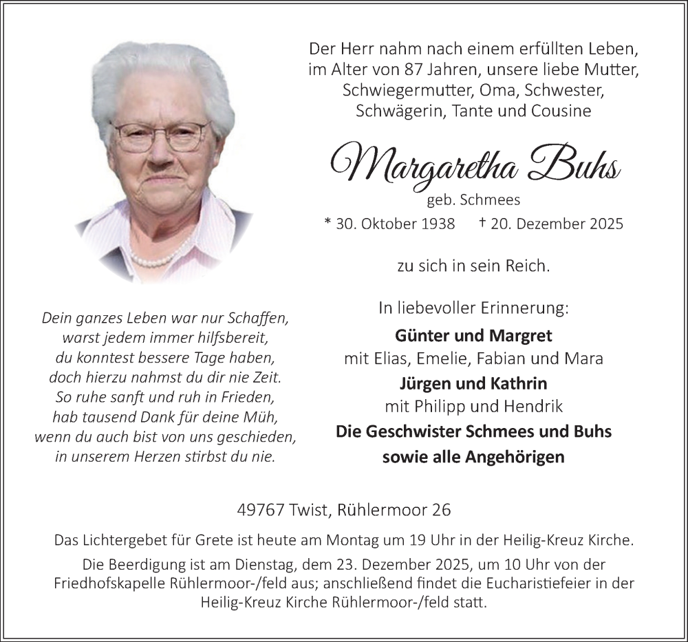 Hier finden Sie alle Traueranzeigen aus der Zeitung, die bisher für Margaretha Buhs erschienen sind. Weitere Traueranzeigen, die in der Zeitung erscheinen, werden hier ebenfalls aufgelistet