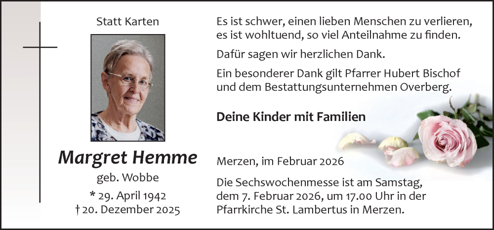 Hier finden Sie alle Traueranzeigen aus der Zeitung, die bisher für Margret Hemme erschienen sind. Weitere Traueranzeigen, die in der Zeitung erscheinen, werden hier ebenfalls aufgelistet