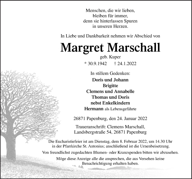 Hier finden Sie alle Traueranzeigen aus der Zeitung, die bisher für Margret Marschall erschienen sind. Weitere Traueranzeigen, die in der Zeitung erscheinen, werden hier ebenfalls aufgelistet