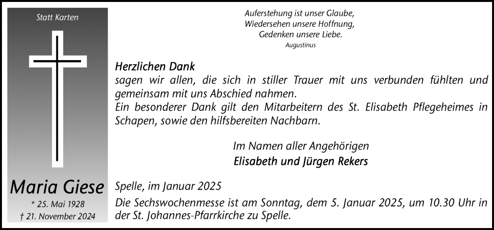Hier finden Sie alle Traueranzeigen aus der Zeitung, die bisher für Maria Giese erschienen sind. Weitere Traueranzeigen, die in der Zeitung erscheinen, werden hier ebenfalls aufgelistet