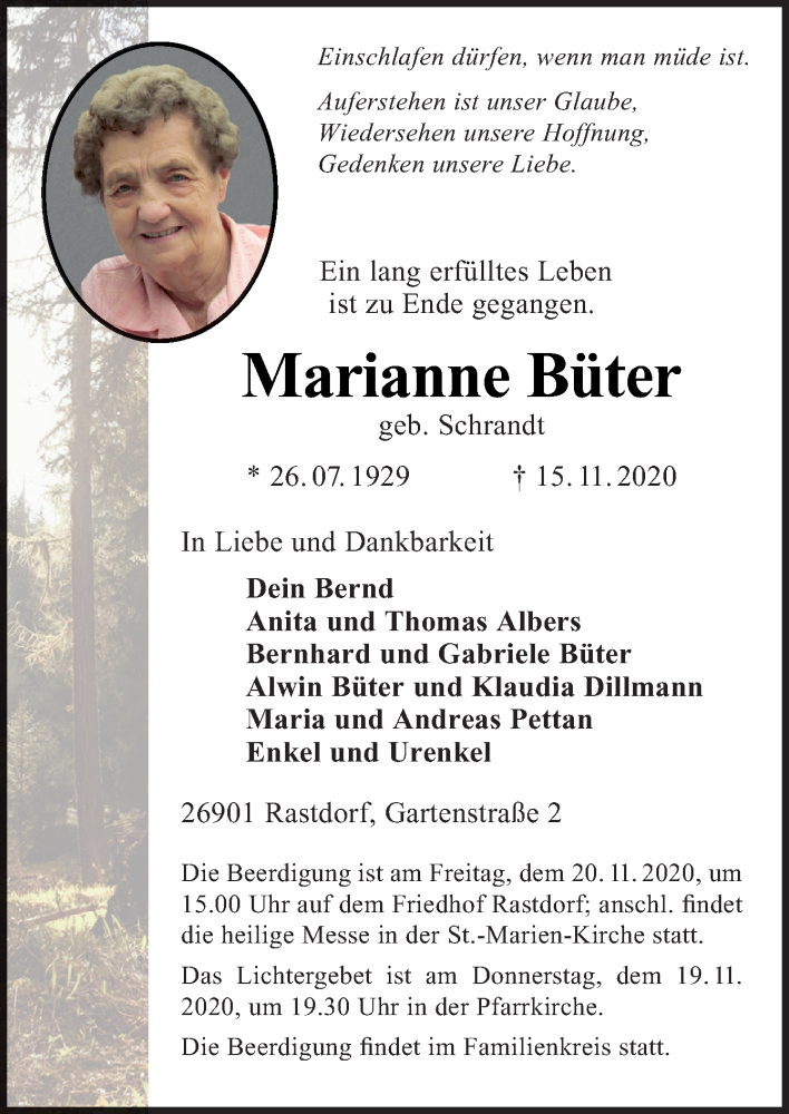 Hier finden Sie alle Traueranzeigen aus der Zeitung, die bisher für Marianne Büter erschienen sind. Weitere Traueranzeigen, die in der Zeitung erscheinen, werden hier ebenfalls aufgelistet