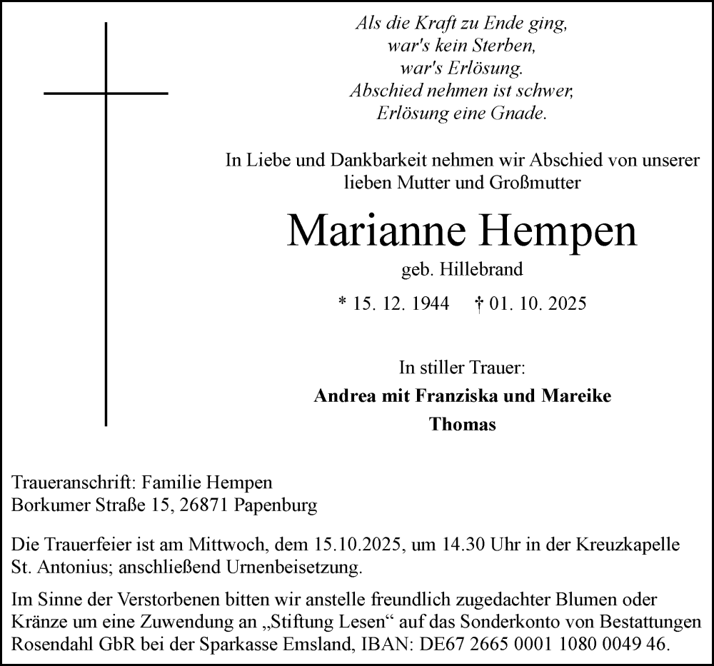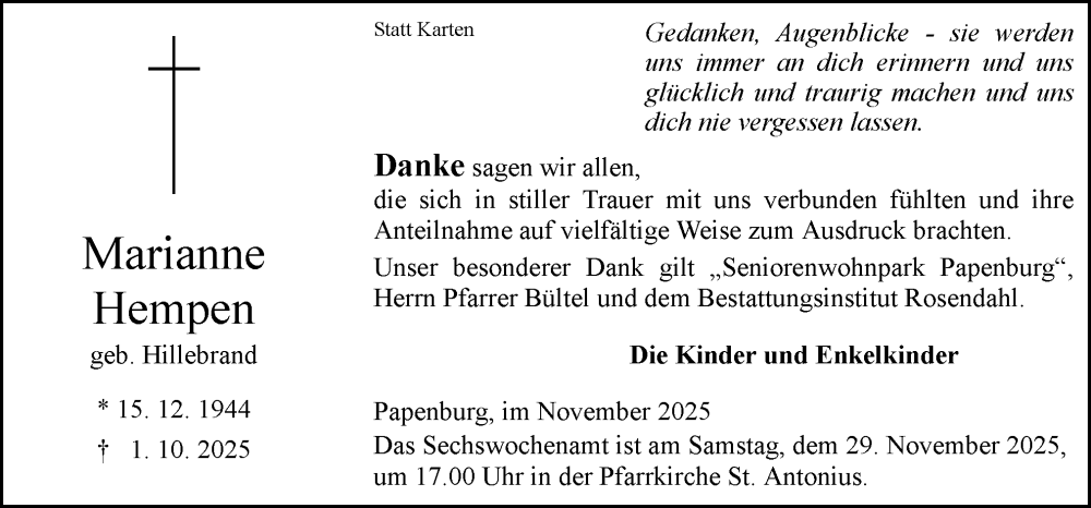 Hier finden Sie alle Traueranzeigen aus der Zeitung, die bisher für Marianne Hempen erschienen sind. Weitere Traueranzeigen, die in der Zeitung erscheinen, werden hier ebenfalls aufgelistet