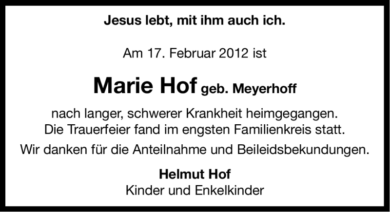 Hier finden Sie alle Traueranzeigen aus der Zeitung, die bisher für Marie Hof erschienen sind. Weitere Traueranzeigen, die in der Zeitung erscheinen, werden hier ebenfalls aufgelistet