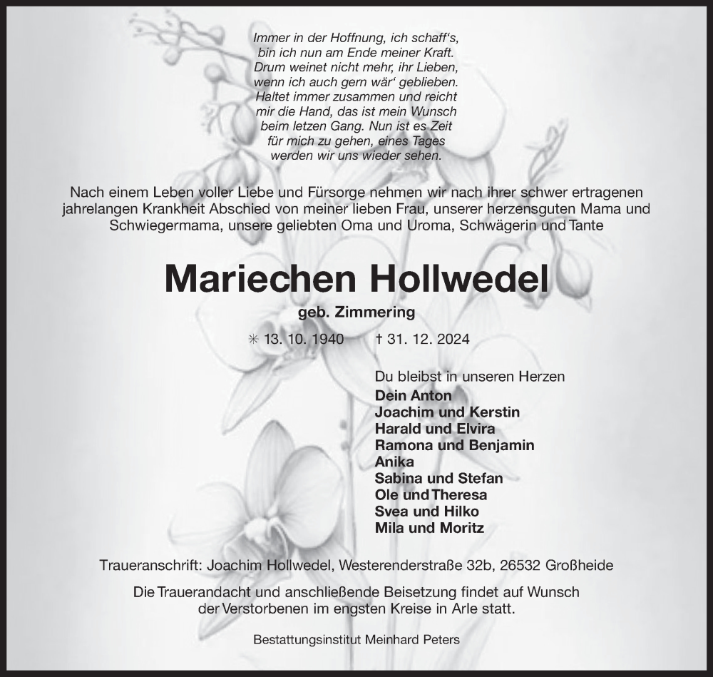 Hier finden Sie alle Traueranzeigen aus der Zeitung, die bisher für Mariechen Hollwedel erschienen sind. Weitere Traueranzeigen, die in der Zeitung erscheinen, werden hier ebenfalls aufgelistet