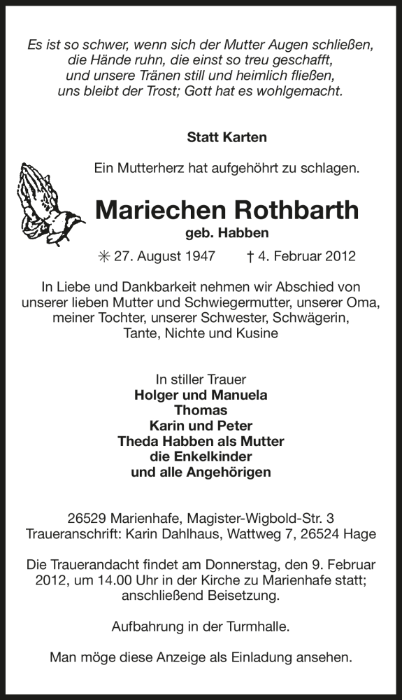 Hier finden Sie alle Traueranzeigen aus der Zeitung, die bisher für Mariechen Rothbarth erschienen sind. Weitere Traueranzeigen, die in der Zeitung erscheinen, werden hier ebenfalls aufgelistet