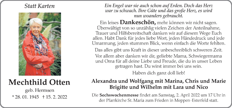 Hier finden Sie alle Traueranzeigen aus der Zeitung, die bisher für Mechthild Otten erschienen sind. Weitere Traueranzeigen, die in der Zeitung erscheinen, werden hier ebenfalls aufgelistet