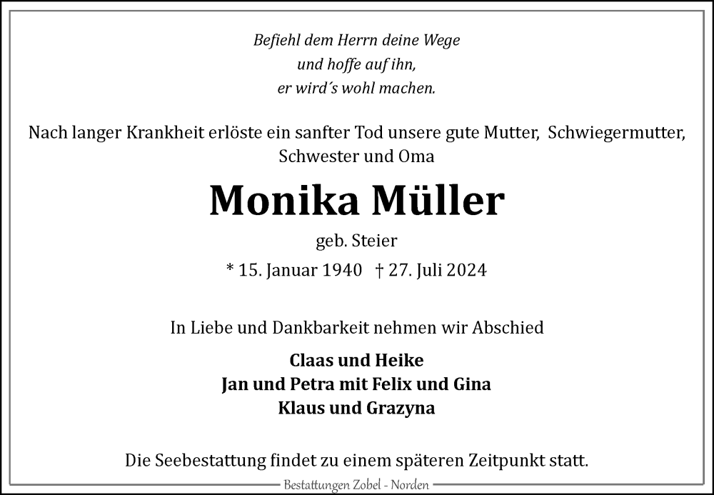 Hier finden Sie alle Traueranzeigen aus der Zeitung, die bisher für Monika Müller erschienen sind. Weitere Traueranzeigen, die in der Zeitung erscheinen, werden hier ebenfalls aufgelistet