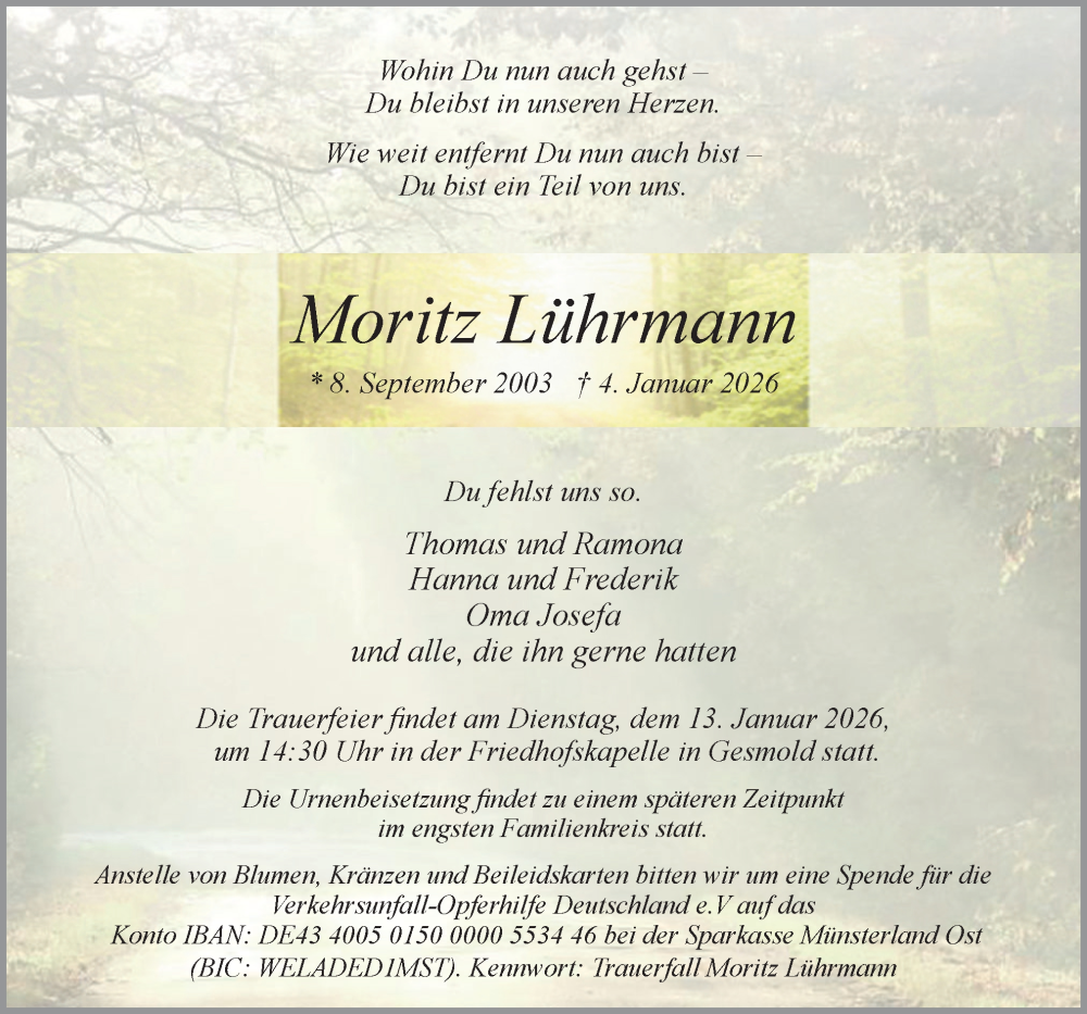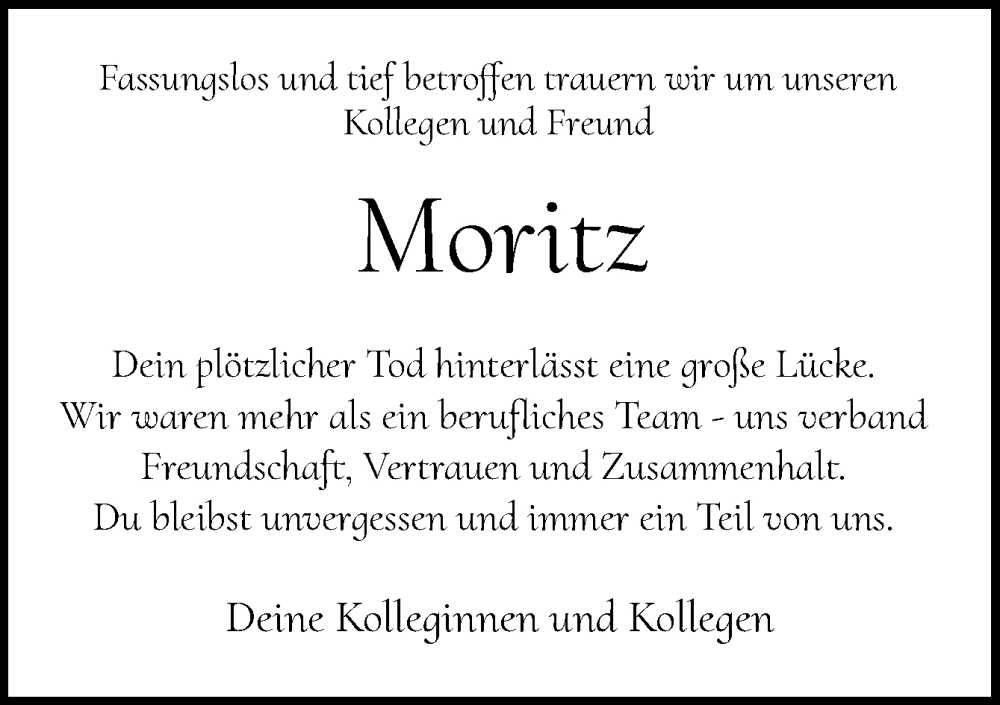 Hier finden Sie alle Traueranzeigen aus der Zeitung, die bisher für Moritz Lührmann erschienen sind. Weitere Traueranzeigen, die in der Zeitung erscheinen, werden hier ebenfalls aufgelistet