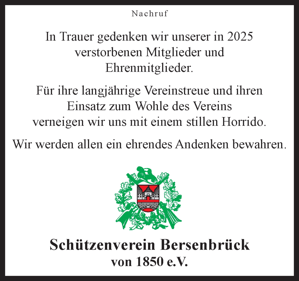 Hier finden Sie alle Traueranzeigen aus der Zeitung, die bisher für Nachruf Schützenverein Bersenbrück von 1850 e.V. erschienen sind. Weitere Traueranzeigen, die in der Zeitung erscheinen, werden hier ebenfalls aufgelistet