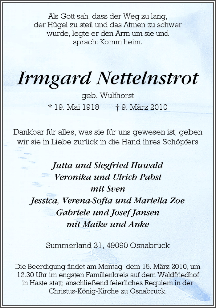Hier finden Sie alle Traueranzeigen aus der Zeitung, die bisher für Irmgard Nettelnstrotm erschienen sind. Weitere Traueranzeigen, die in der Zeitung erscheinen, werden hier ebenfalls aufgelistet