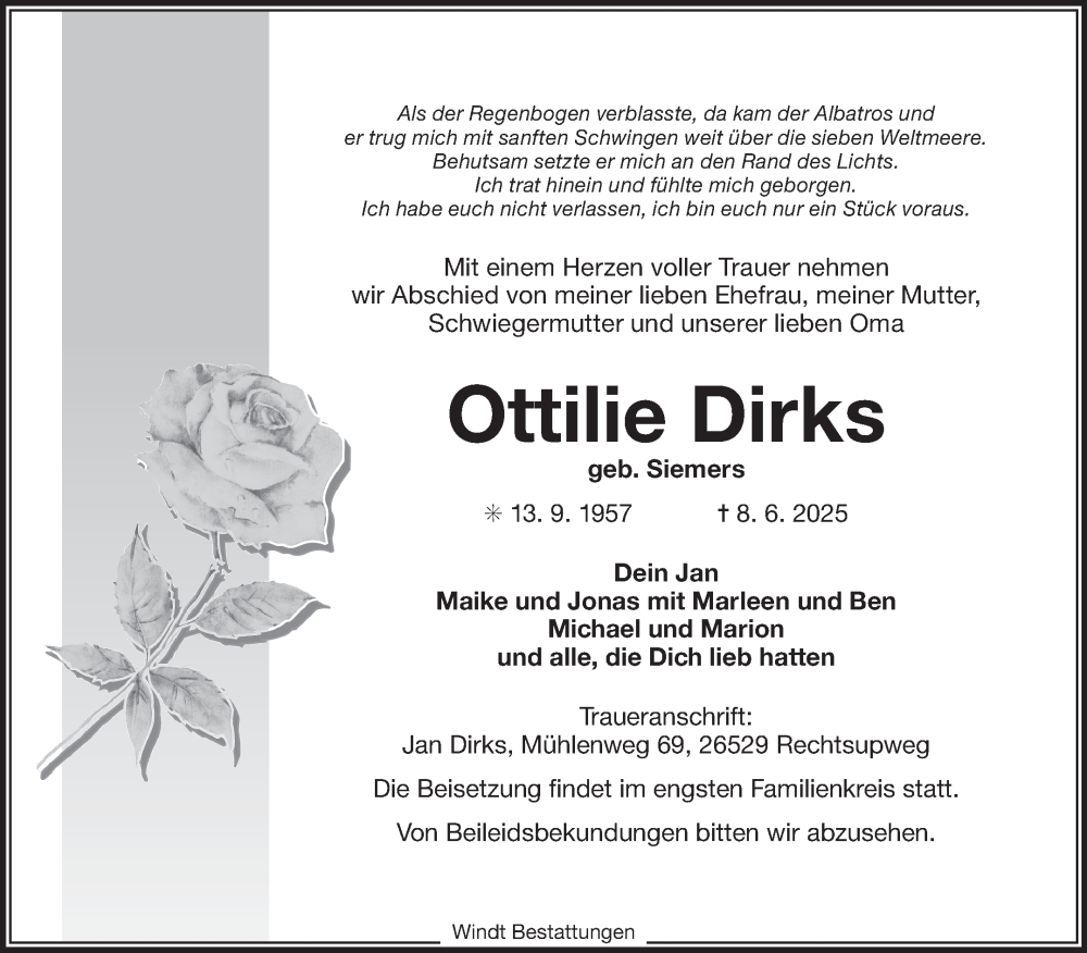 Hier finden Sie alle Traueranzeigen aus der Zeitung, die bisher für Ottilie Dirks erschienen sind. Weitere Traueranzeigen, die in der Zeitung erscheinen, werden hier ebenfalls aufgelistet