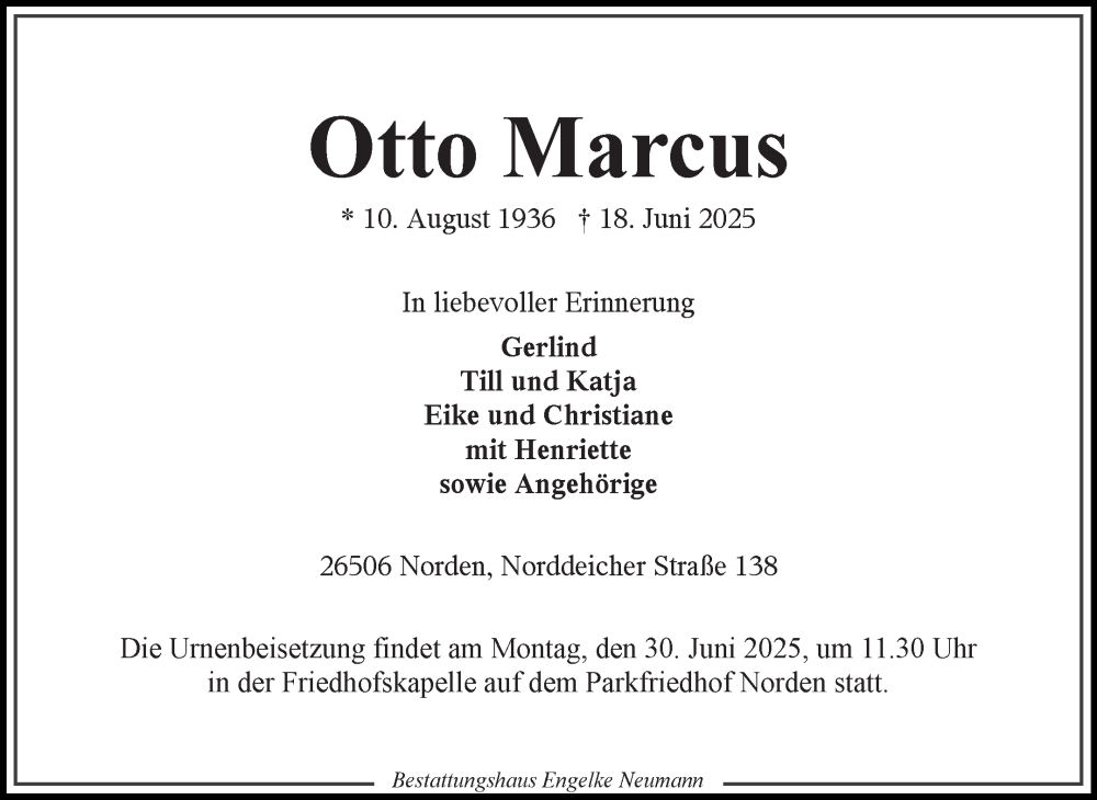 Hier finden Sie alle Traueranzeigen aus der Zeitung, die bisher für Otto Marcus erschienen sind. Weitere Traueranzeigen, die in der Zeitung erscheinen, werden hier ebenfalls aufgelistet