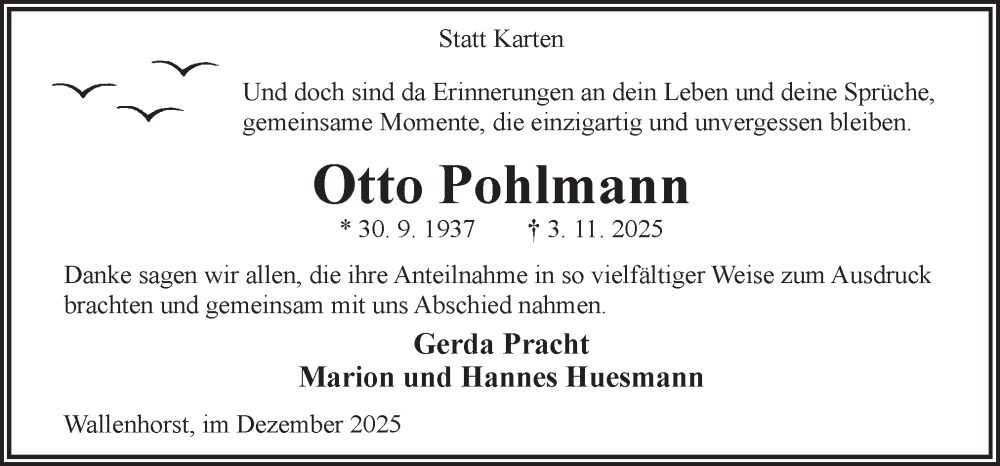 Hier finden Sie alle Traueranzeigen aus der Zeitung, die bisher für Otto Pohlmann erschienen sind. Weitere Traueranzeigen, die in der Zeitung erscheinen, werden hier ebenfalls aufgelistet