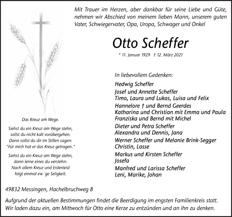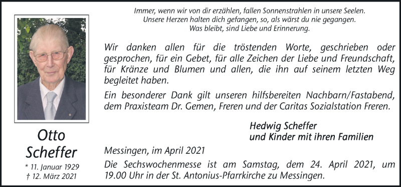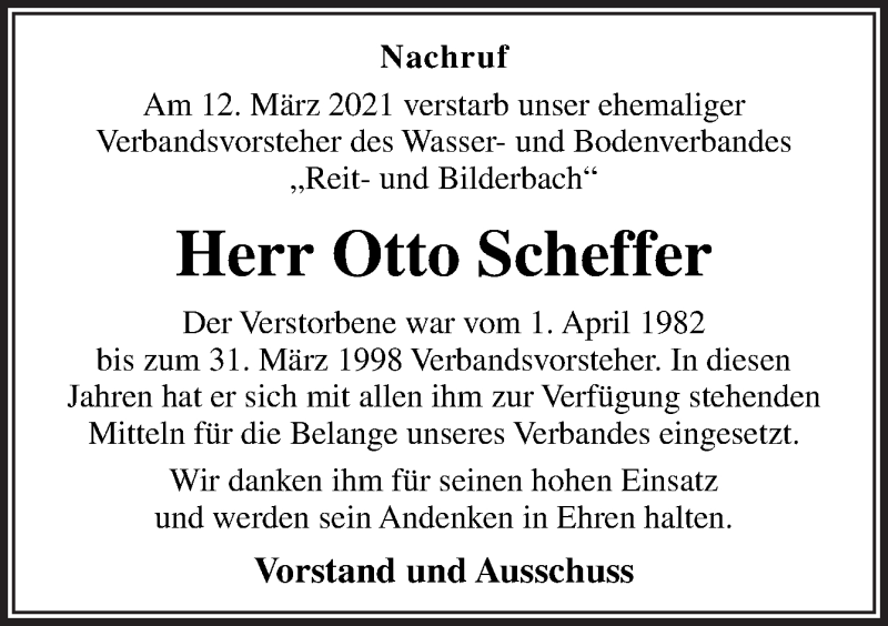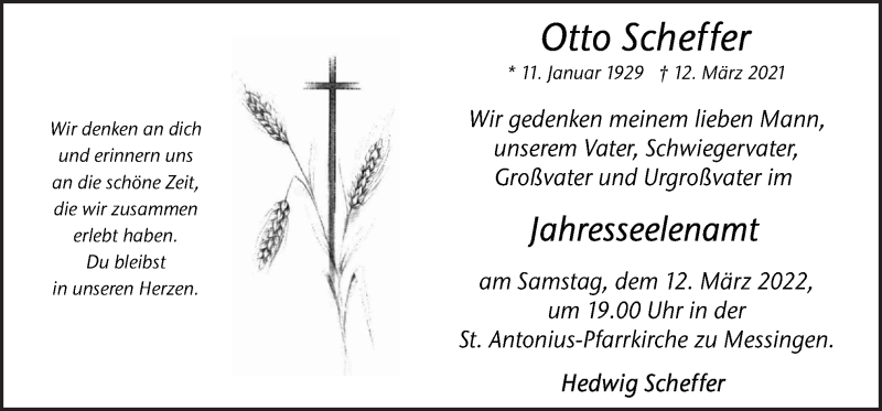 Hier finden Sie alle Traueranzeigen aus der Zeitung, die bisher für Otto Scheffer erschienen sind. Weitere Traueranzeigen, die in der Zeitung erscheinen, werden hier ebenfalls aufgelistet