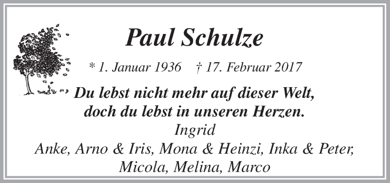 Hier finden Sie alle Traueranzeigen aus der Zeitung, die bisher für Paul Schulze erschienen sind. Weitere Traueranzeigen, die in der Zeitung erscheinen, werden hier ebenfalls aufgelistet