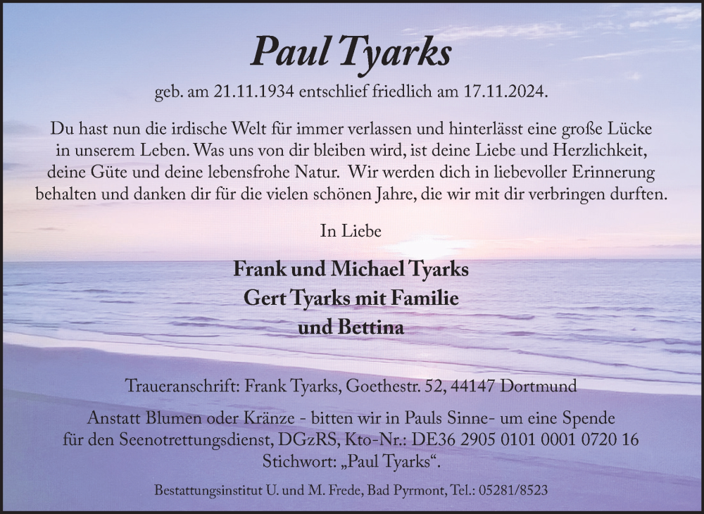 Hier finden Sie alle Traueranzeigen aus der Zeitung, die bisher für Paul Tyarks erschienen sind. Weitere Traueranzeigen, die in der Zeitung erscheinen, werden hier ebenfalls aufgelistet