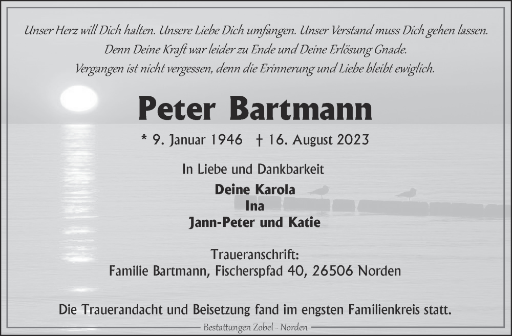 Hier finden Sie alle Traueranzeigen aus der Zeitung, die bisher für Peter Bartmann erschienen sind. Weitere Traueranzeigen, die in der Zeitung erscheinen, werden hier ebenfalls aufgelistet