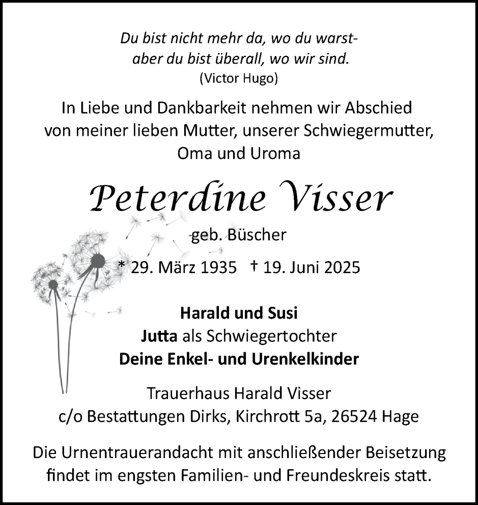 Hier finden Sie alle Traueranzeigen aus der Zeitung, die bisher für Peterdine Visser erschienen sind. Weitere Traueranzeigen, die in der Zeitung erscheinen, werden hier ebenfalls aufgelistet