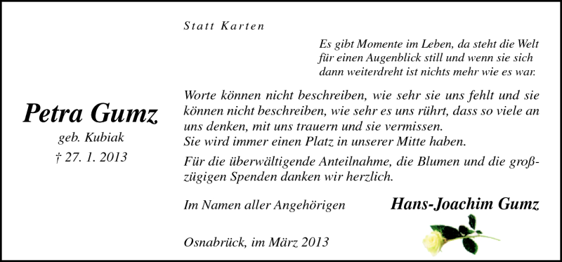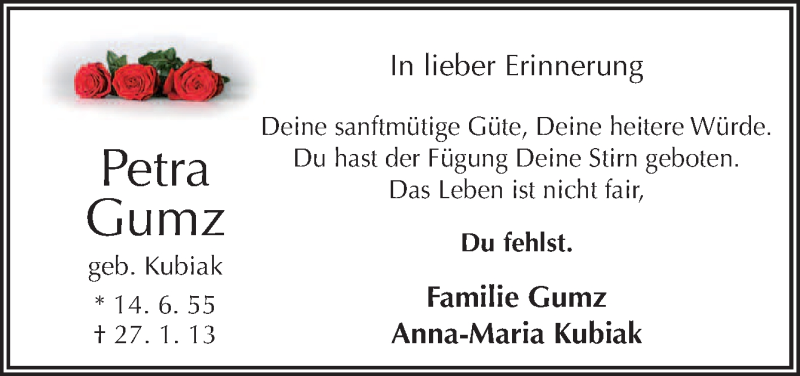 Hier finden Sie alle Traueranzeigen aus der Zeitung, die bisher für Petra Gumz erschienen sind. Weitere Traueranzeigen, die in der Zeitung erscheinen, werden hier ebenfalls aufgelistet
