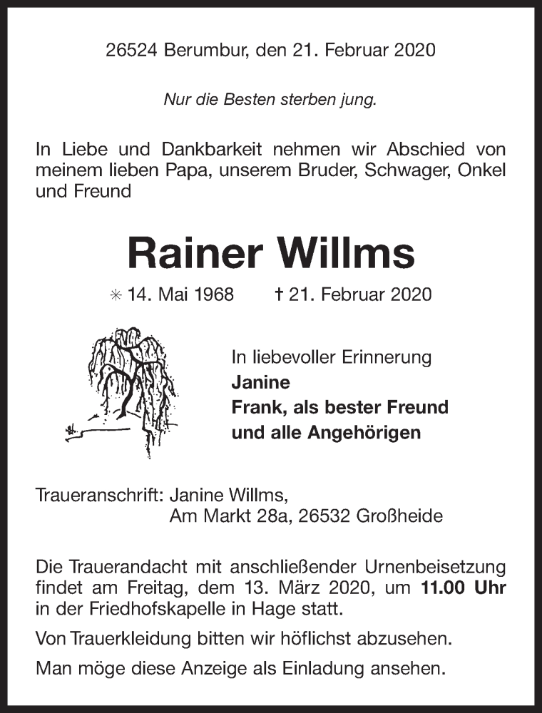Hier finden Sie alle Traueranzeigen aus der Zeitung, die bisher für Rainer Willms erschienen sind. Weitere Traueranzeigen, die in der Zeitung erscheinen, werden hier ebenfalls aufgelistet