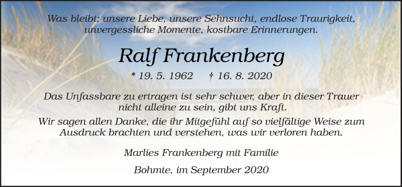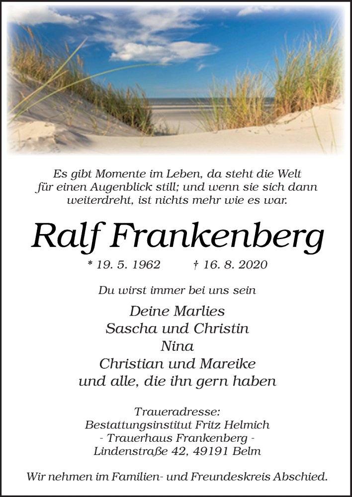 Hier finden Sie alle Traueranzeigen aus der Zeitung, die bisher für Ralf Frankenberg erschienen sind. Weitere Traueranzeigen, die in der Zeitung erscheinen, werden hier ebenfalls aufgelistet