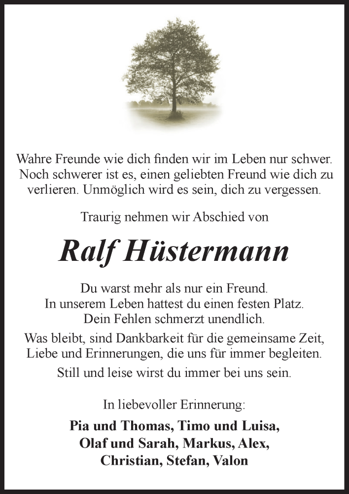 Hier finden Sie alle Traueranzeigen aus der Zeitung, die bisher für Ralf Hüstermann erschienen sind. Weitere Traueranzeigen, die in der Zeitung erscheinen, werden hier ebenfalls aufgelistet