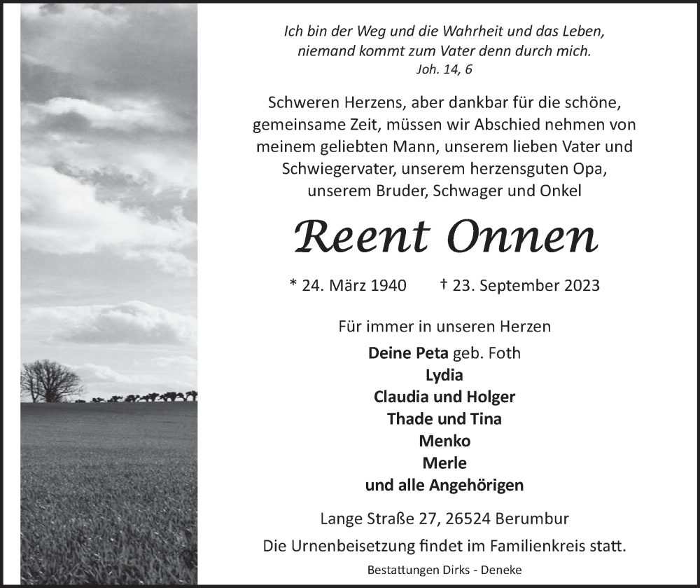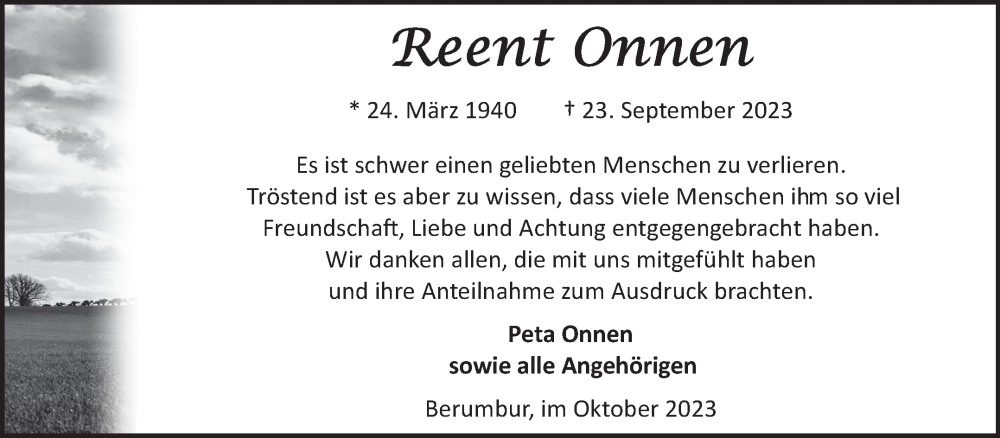 Hier finden Sie alle Traueranzeigen aus der Zeitung, die bisher für Reent Onnen erschienen sind. Weitere Traueranzeigen, die in der Zeitung erscheinen, werden hier ebenfalls aufgelistet