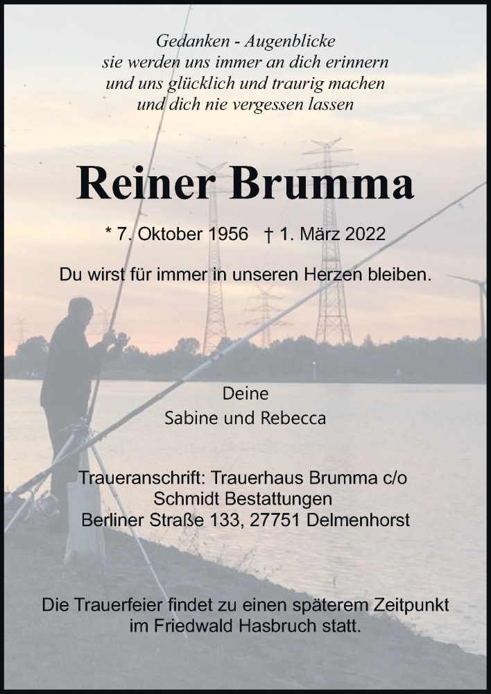 Hier finden Sie alle Traueranzeigen aus der Zeitung, die bisher für Reiner Brumma erschienen sind. Weitere Traueranzeigen, die in der Zeitung erscheinen, werden hier ebenfalls aufgelistet