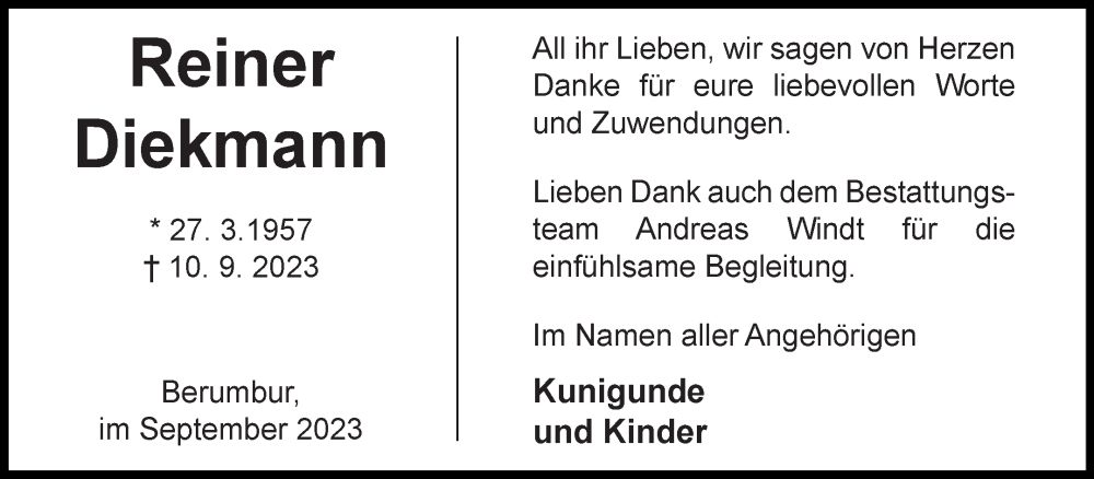 Hier finden Sie alle Traueranzeigen aus der Zeitung, die bisher für Reiner Diekmann erschienen sind. Weitere Traueranzeigen, die in der Zeitung erscheinen, werden hier ebenfalls aufgelistet
