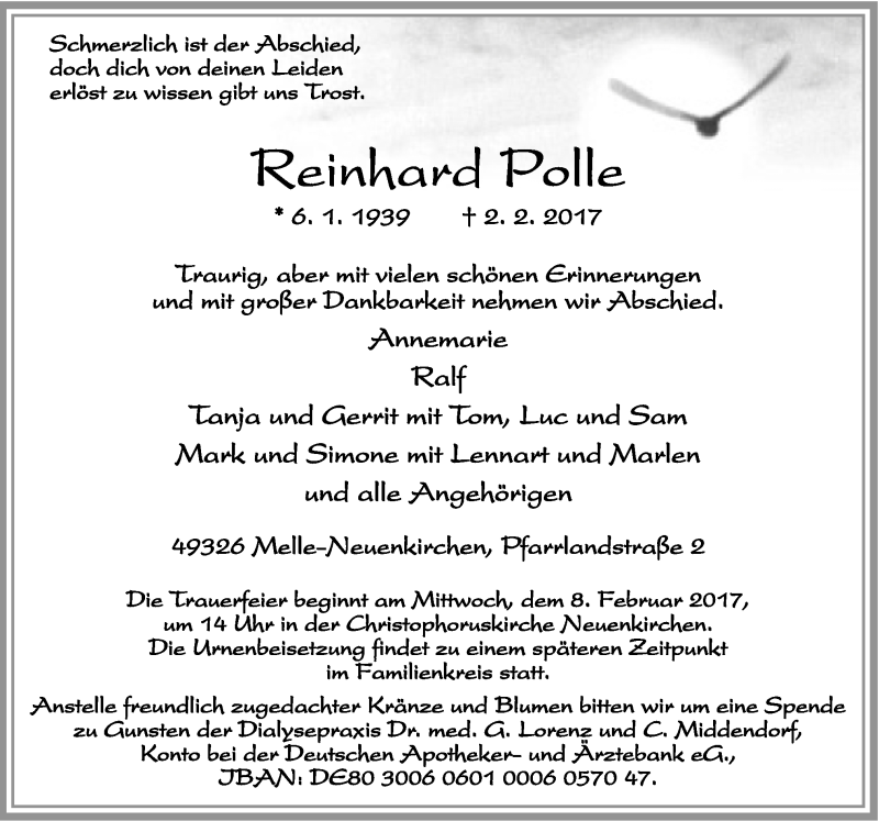 Hier finden Sie alle Traueranzeigen aus der Zeitung, die bisher für Reinhard Polle erschienen sind. Weitere Traueranzeigen, die in der Zeitung erscheinen, werden hier ebenfalls aufgelistet