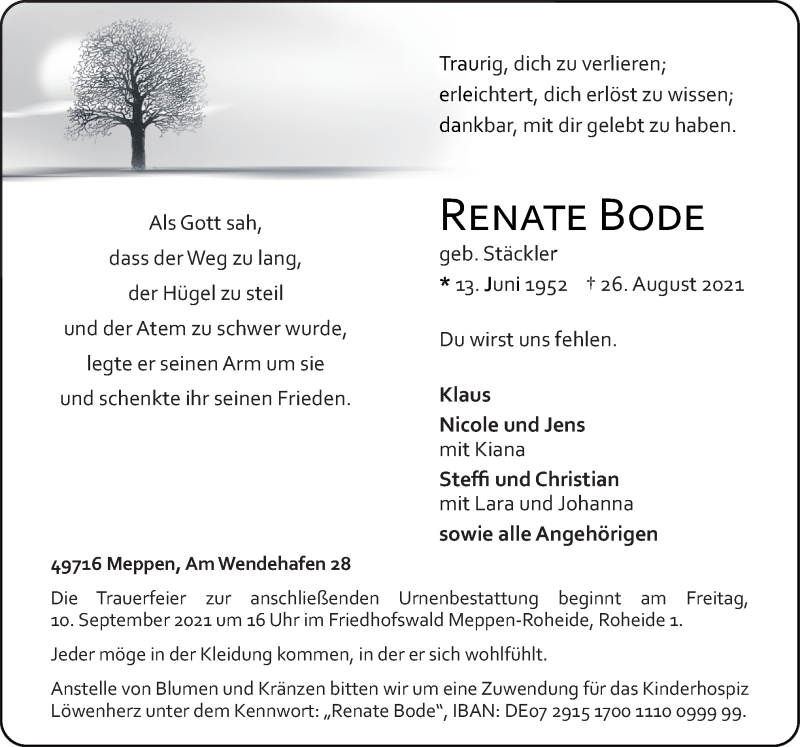 Hier finden Sie alle Traueranzeigen aus der Zeitung, die bisher für Renate Bode erschienen sind. Weitere Traueranzeigen, die in der Zeitung erscheinen, werden hier ebenfalls aufgelistet