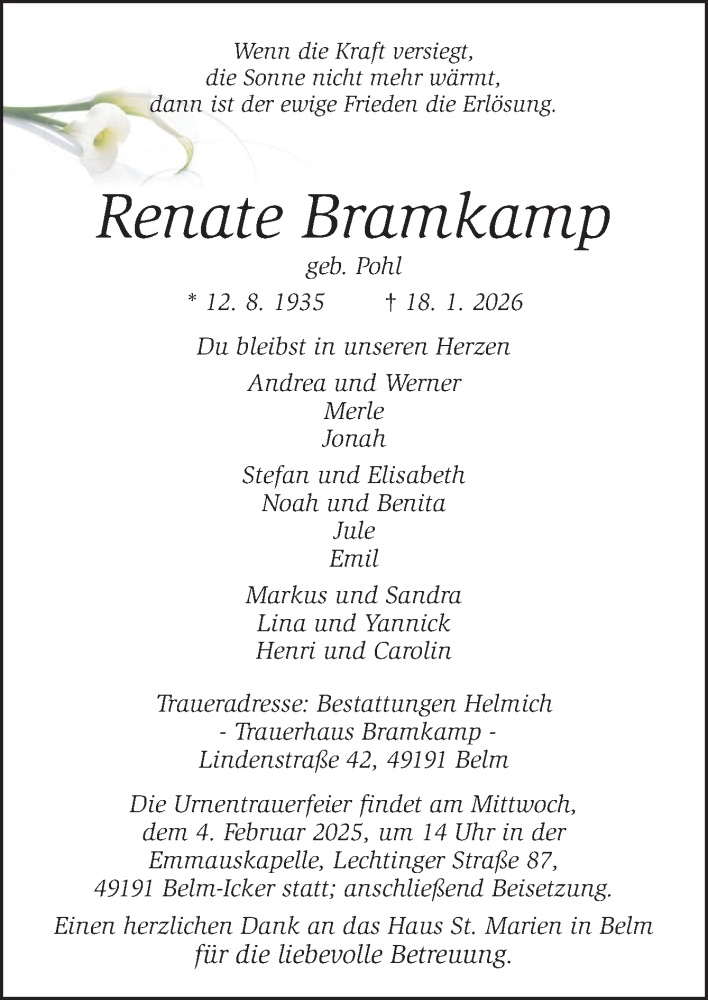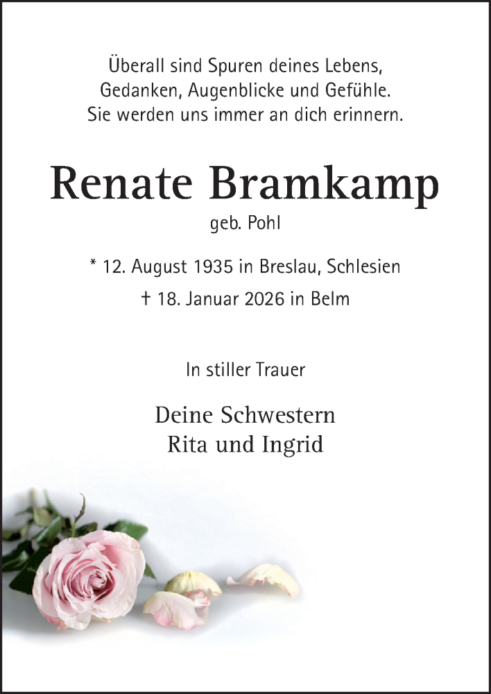 Hier finden Sie alle Traueranzeigen aus der Zeitung, die bisher für Renate Bramkamp erschienen sind. Weitere Traueranzeigen, die in der Zeitung erscheinen, werden hier ebenfalls aufgelistet