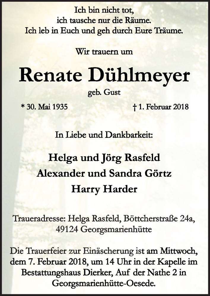 Hier finden Sie alle Traueranzeigen aus der Zeitung, die bisher für Renate Dühlmeyer erschienen sind. Weitere Traueranzeigen, die in der Zeitung erscheinen, werden hier ebenfalls aufgelistet