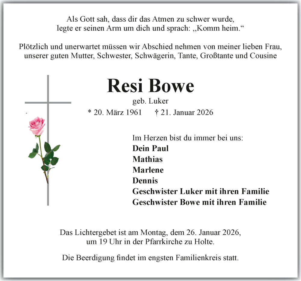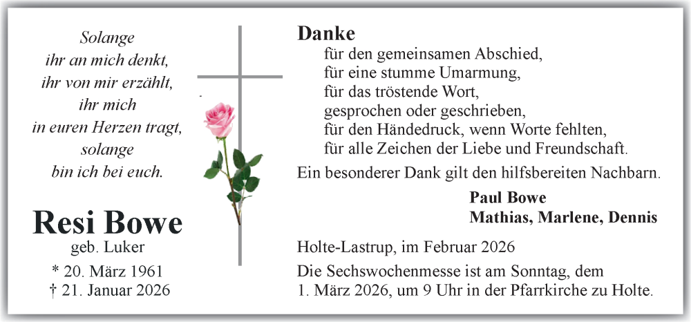 Hier finden Sie alle Traueranzeigen aus der Zeitung, die bisher für Resi Bowe erschienen sind. Weitere Traueranzeigen, die in der Zeitung erscheinen, werden hier ebenfalls aufgelistet