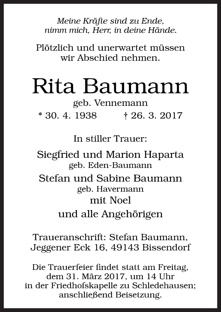 Hier finden Sie alle Traueranzeigen aus der Zeitung, die bisher für Rita Baumann erschienen sind. Weitere Traueranzeigen, die in der Zeitung erscheinen, werden hier ebenfalls aufgelistet