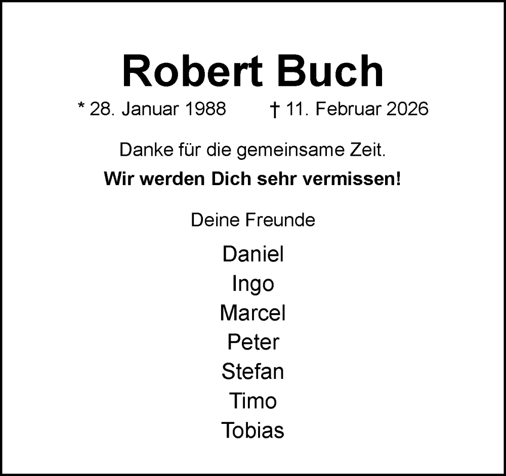 Hier finden Sie alle Traueranzeigen aus der Zeitung, die bisher für Robert Buch erschienen sind. Weitere Traueranzeigen, die in der Zeitung erscheinen, werden hier ebenfalls aufgelistet