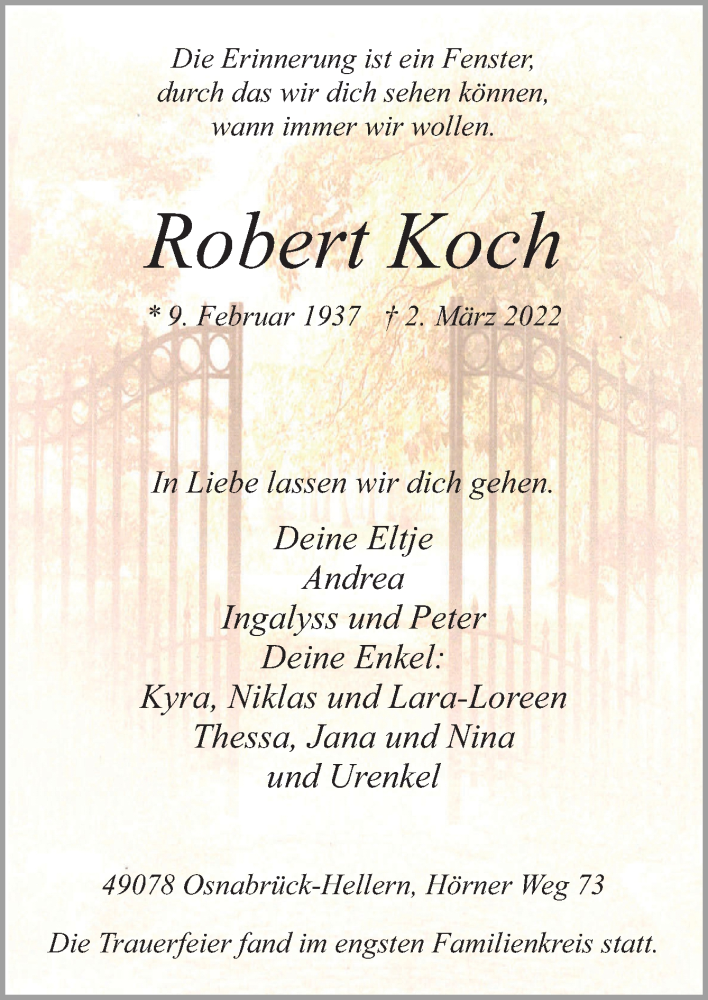 Hier finden Sie alle Traueranzeigen aus der Zeitung, die bisher für Robert Koch erschienen sind. Weitere Traueranzeigen, die in der Zeitung erscheinen, werden hier ebenfalls aufgelistet