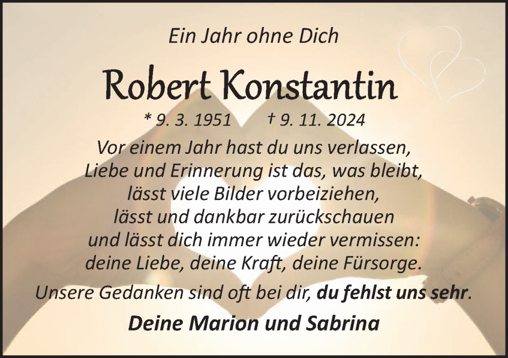 Hier finden Sie alle Traueranzeigen aus der Zeitung, die bisher für Robert Konstantin erschienen sind. Weitere Traueranzeigen, die in der Zeitung erscheinen, werden hier ebenfalls aufgelistet