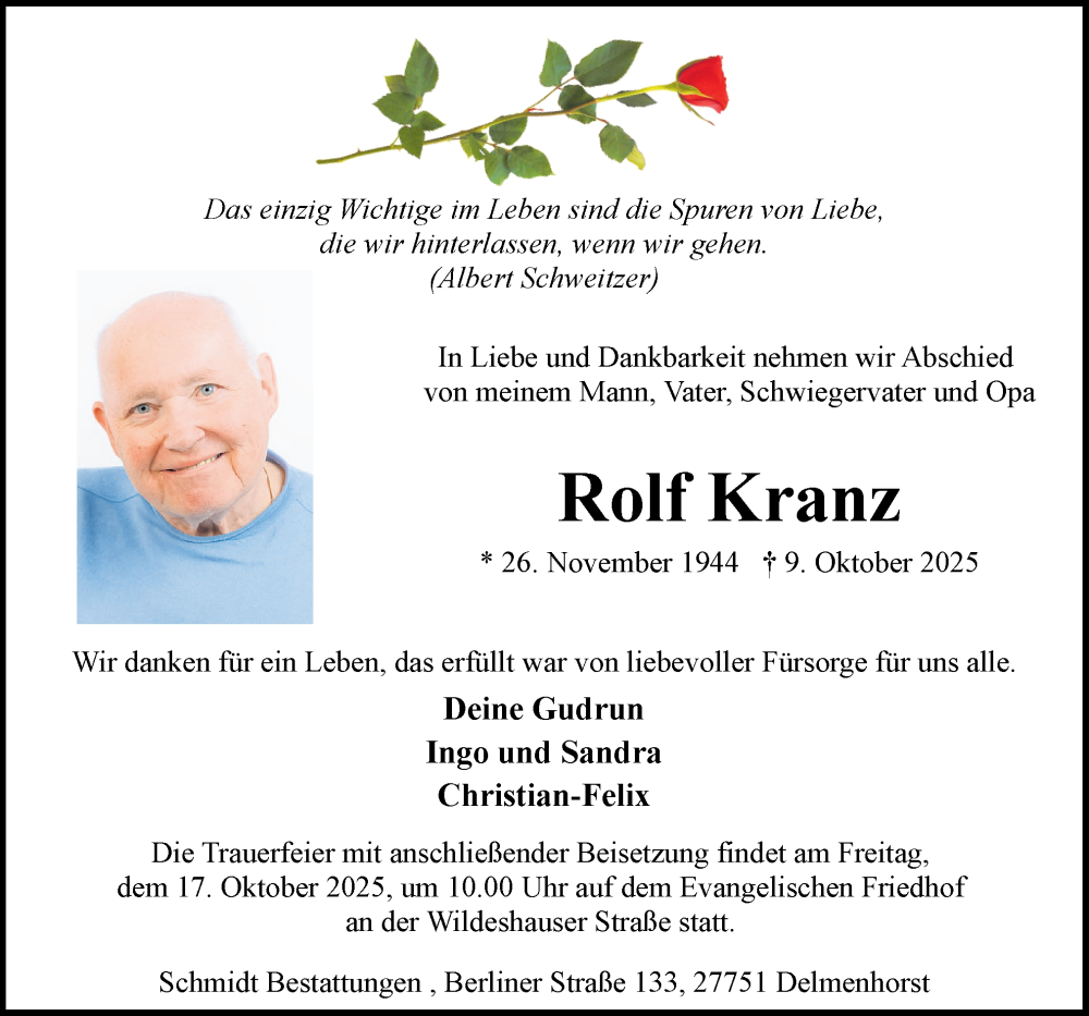 Hier finden Sie alle Traueranzeigen aus der Zeitung, die bisher für Rolf Kranz erschienen sind. Weitere Traueranzeigen, die in der Zeitung erscheinen, werden hier ebenfalls aufgelistet