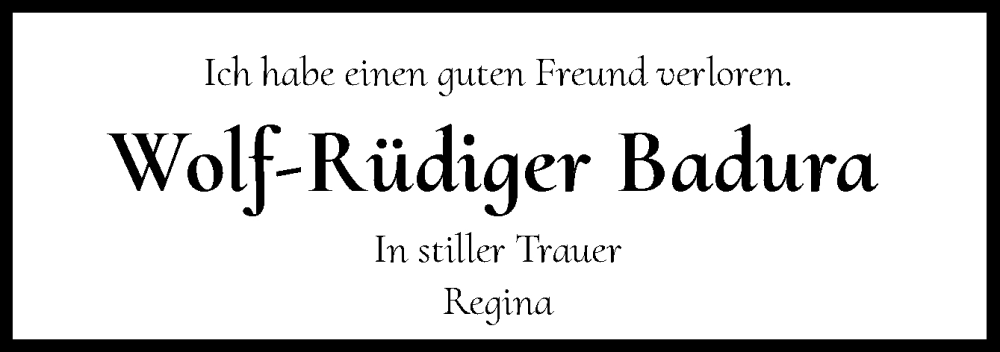 Hier finden Sie alle Traueranzeigen aus der Zeitung, die bisher für Rolf-Rüdiger Badura erschienen sind. Weitere Traueranzeigen, die in der Zeitung erscheinen, werden hier ebenfalls aufgelistet